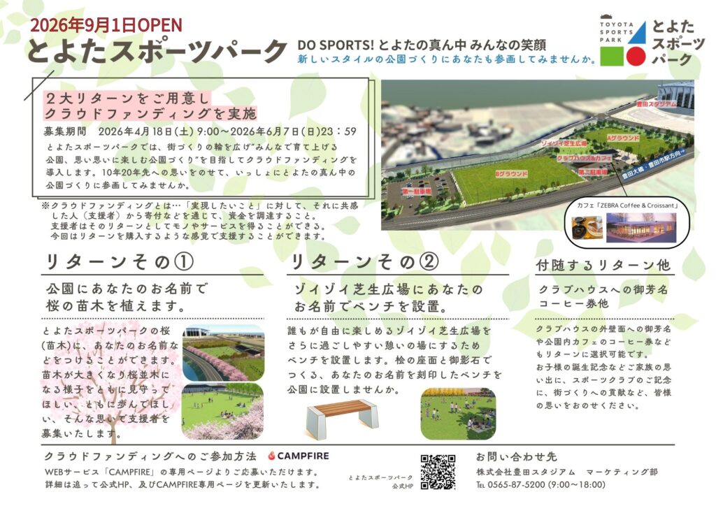 2026.03.18 クラウドファンディングの導入について 新しいスタイルの公園づくりに参画してみませんか? 4月18日(土)9:00より受付開始! 近日公開予定のWEBサービス「CAMPFIRE」専用ページよりご応募ください。